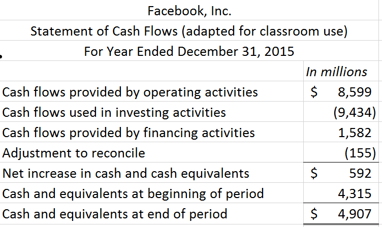 To follow are Facebook’s four basic financial statements for its most recent year, the year ending December 31, 2015. Please note that all statements have been adapted and condensed for educational use and should not be used for investment decisions.